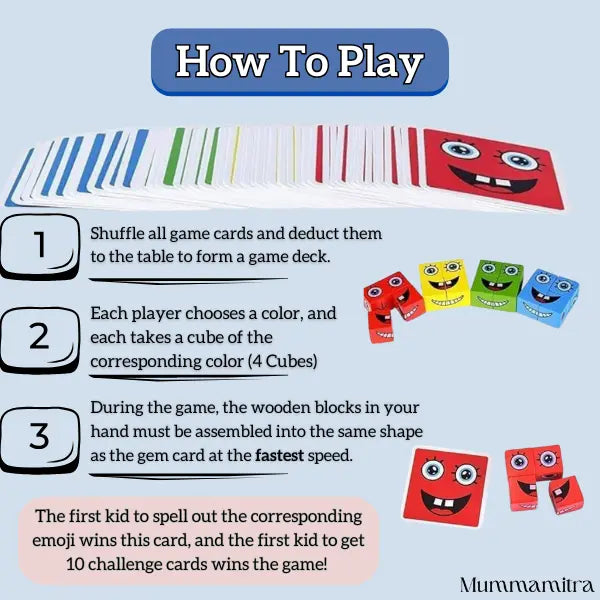 Get ready for endless fun! Start by shuffling the game cards and choosing your color. Each player receives a set of four blocks, then races to match the face on the game card as fast as possible! The first to collect 10 challenge cards wins! WonderFaces™ is perfect for building speed, focus, and creative thinking in a fun and interactive way. Let the face-changing fun begin!"